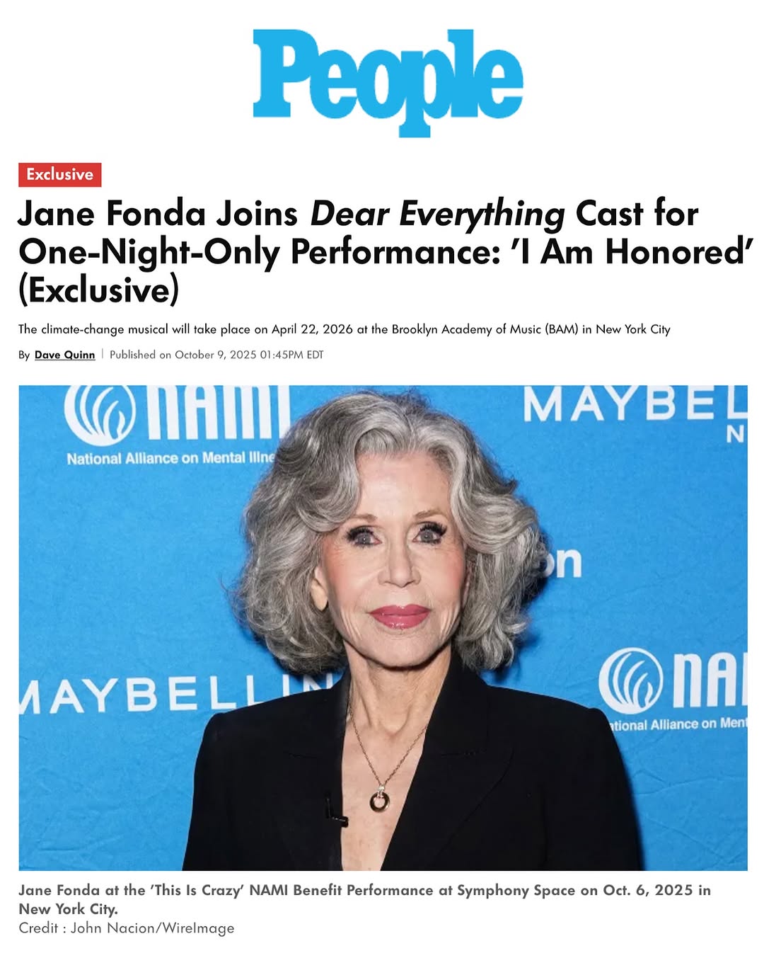 On the heels of its first tour, Dear Everything: A Musical Uprising for the Earth is coming to BAM in NYC on Earth Day (April 22) 2026 – featuring the iconic Jane Fonda in the role of narrator.